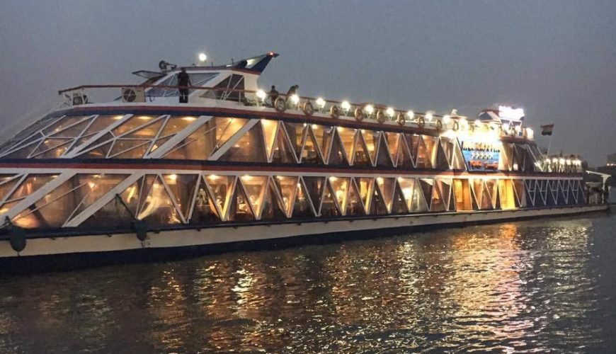 Pase una velada navegando por el Nilo en un paseo nocturno en barco que incluye cena y espectáculo en directo. Tras una recogida, embárquese en una romántica noche en el agua. Disfrute de una deliciosa cena buffet, escuche música en directo y asista a un espectáculo de danza tradicional. Contemple las maravillosas vistas de El Cairo iluminado por las deslumbrantes luces de la ciudad mientras saborea una cena especial de bufé abierto.